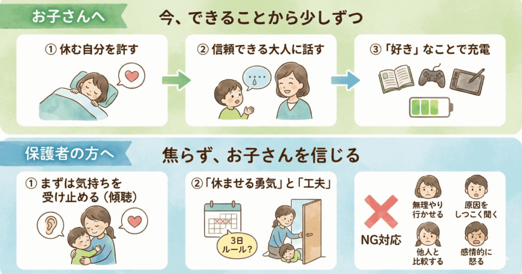 そして、お子さんなりの方法で、今の学校のルールや環境とどう「折り合い」をつけていくか、将来のためにどんな準備ができるかを一緒に考えていくことです。