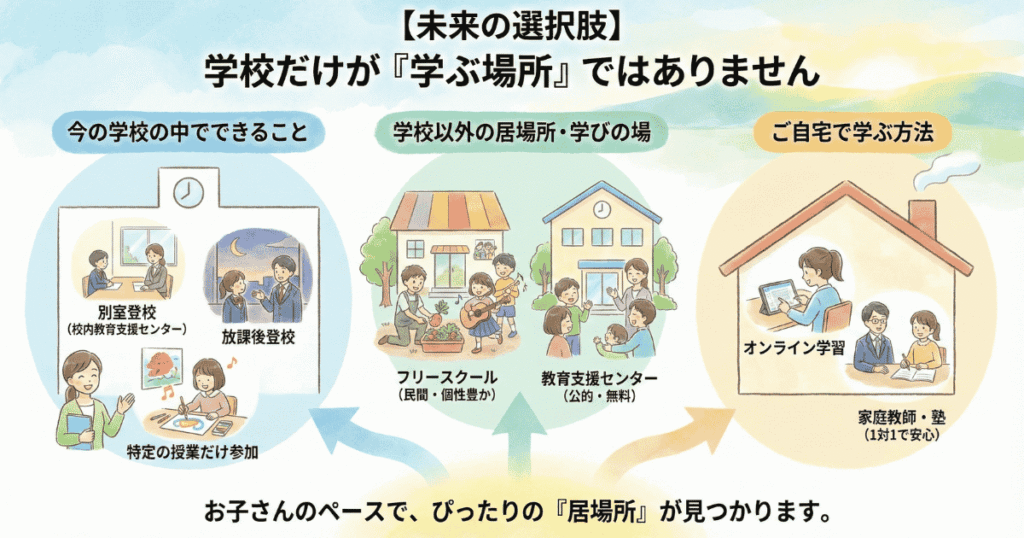 お子さんのエネルギーが回復するまで、あるいは、お子さんにもっと合う環境を探すために、学校以外の「居場所」や「学びの場」に目を向けてみるのも、大切な選択肢の一つです。