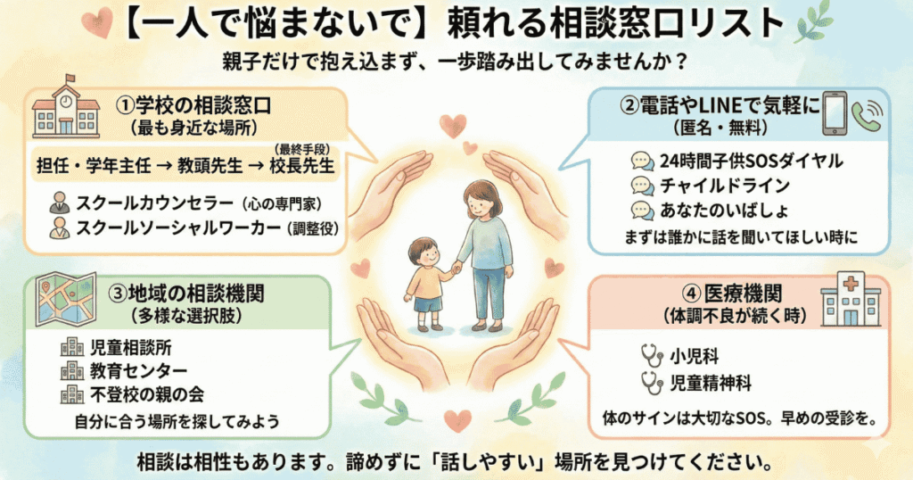 もし、担任の先生には直接伝えづらかったり、お子さんが親御さんにも話しにくい様子だったりする場合は、ご家庭だけで抱え込む必要はありません。