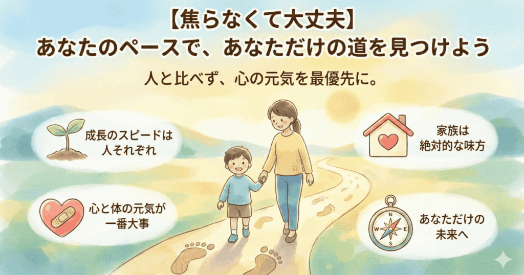 今、何よりも一番大事なのは、お子さんの心と体が元気でいられることです。 誰かと比べるのではなく、お子さん自身のペースで、ほんの少しでも「やってみよう」と思えたなら、それで十分すぎるほどです。