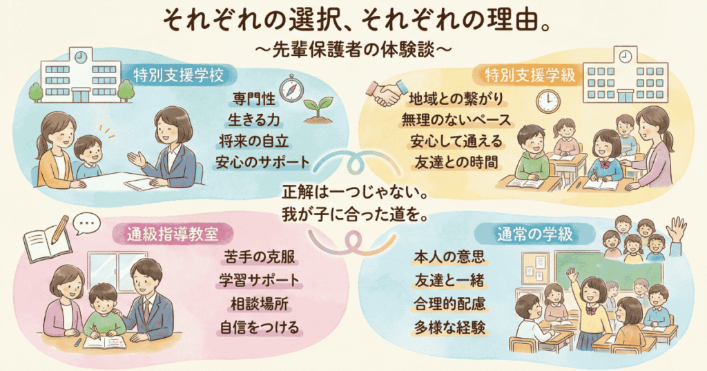 特別支援学級や特別支援学校、通級指導教室の特徴を知り、体験談を読んでも、実際に選択するとなると迷ってしまいますよね。