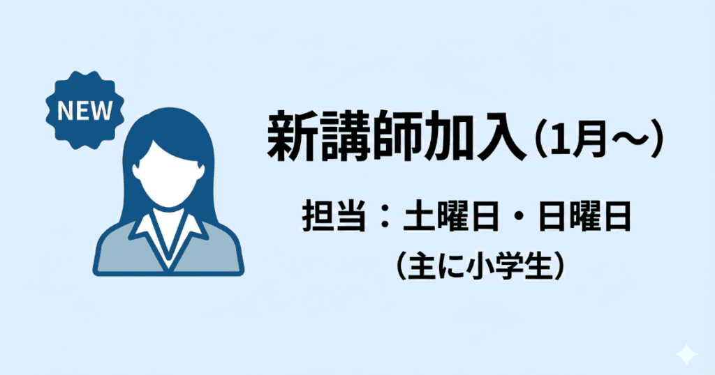 1月より新しい講師が1名加わります。 基本的には「土曜日・日曜日」の授業(主に小学生)を担当予定です。 詳細なプロフィールは改めてご紹介いたしますが、担当変更のご希望などがございましたらご相談ください。