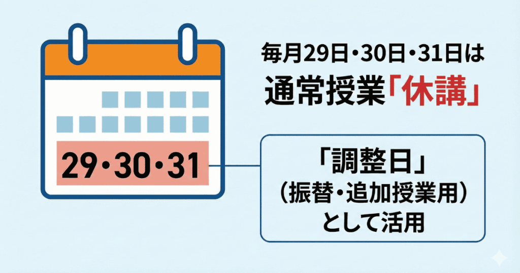授業回数の平準化と指導枠確保のため、3月より毎月29日・30日・31日は通常授業をお休み(休講日)とさせていただきます。 この期間は、主に「振替授業」や「追加授業」を行うための「調整日」として充てる予定です。 ※通常の振替はこれまで通り土日等も可能ですが、今後はこの「調整日」もぜひご活用ください。