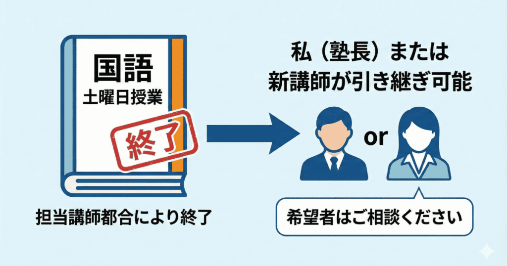これまで月2回程度実施しておりました土曜日の国語授業(外部講師担当)ですが、担当講師の都合により終了することとなりました。 4月以降、当該講師による再開の見込みは立っておりませんが、ご希望の場合は、私(塾長)もしくは新しい講師がカリキュラムを引き継ぎ、指導を行うことが可能です。お気軽にご相談ください。